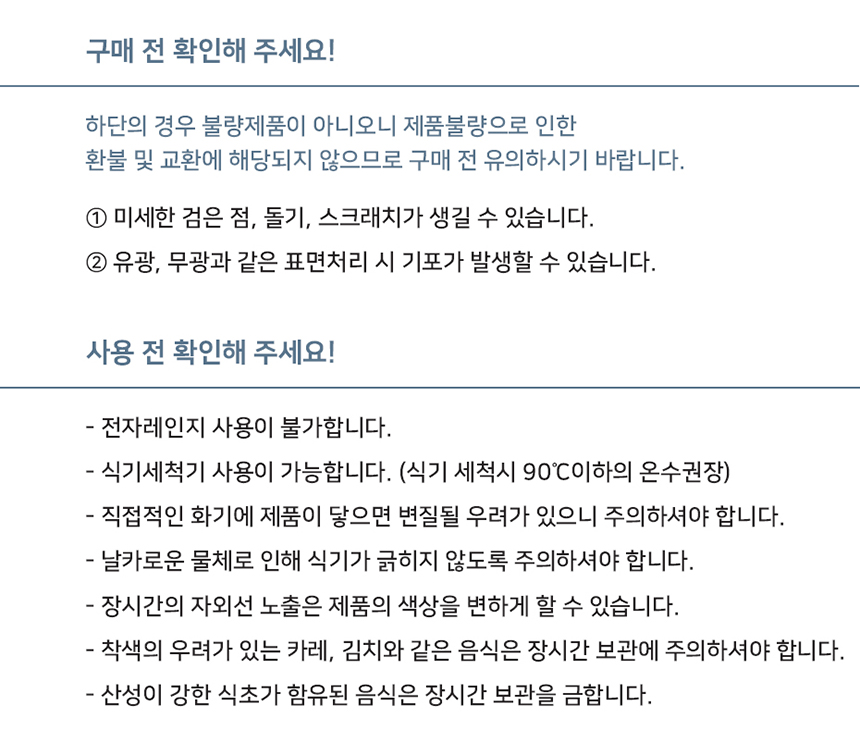 | 제품 배송 후 7일 이후 또는 구매자의 부주의나 사용으로 인한 상품훼손 및 택 제거 등 상품가치 상실의 경우 교환 및 반품이 불가하오니 이점 참고하시기 바랍니다. |